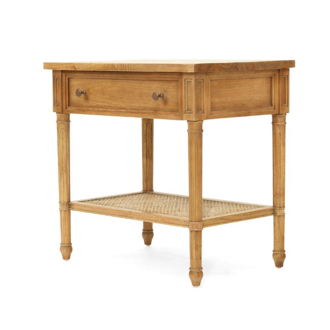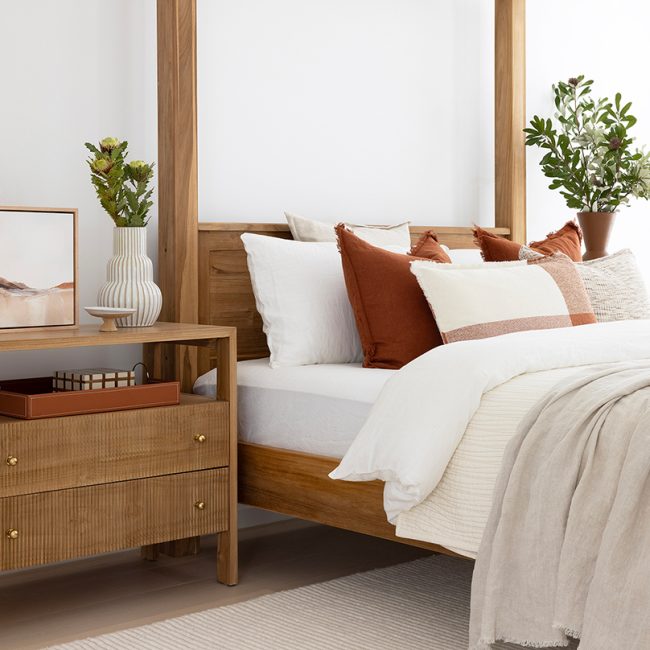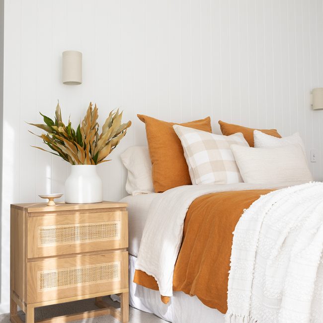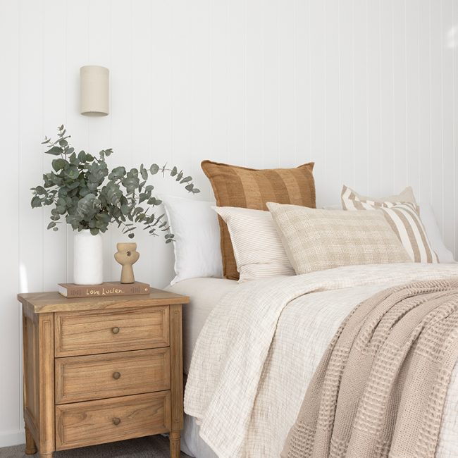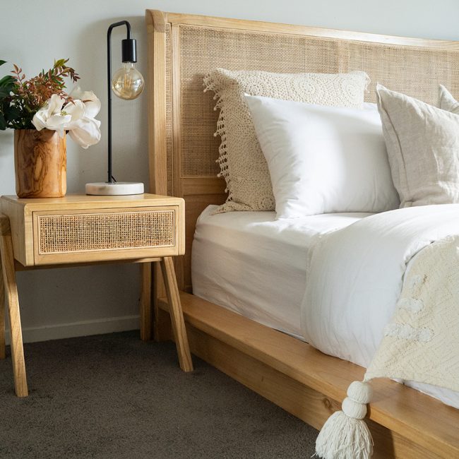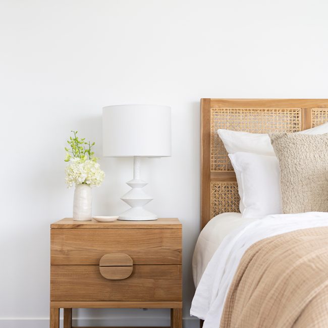 Our bedside tables balance surface, storage, and style. Timber and rattan options bring natural warmth; painted finishes add crisp definition. Pair as a symmetrical set beside your bed, coordinate handles with your dresser, and finish with sculptural lamps. Keep the palette cohesive and consider a round mirror above the dresser to reflect light.