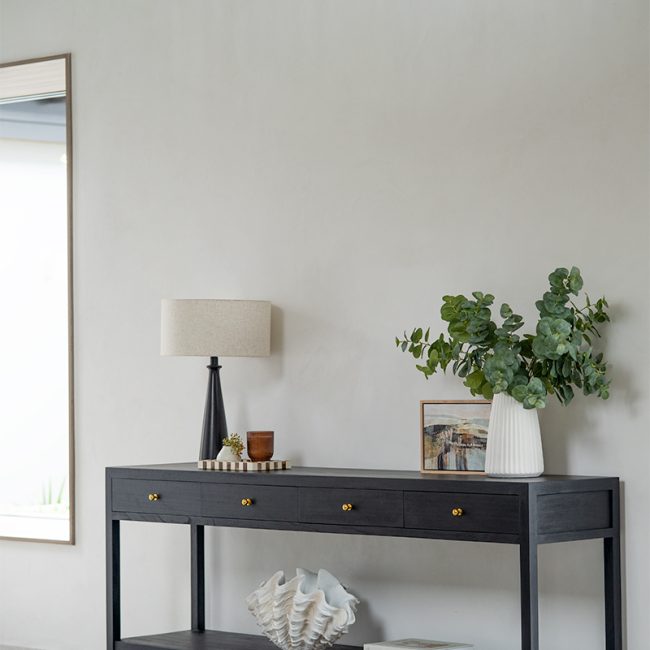 The Camden Console Table brings together refined craftsmanship and natural texture, creating a statement piece that feels both grounded and elevated. Handcrafted from solid mahogany and finished in a deep black tone, it offers a bold, timeless foundation suited to a range of interiors.